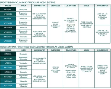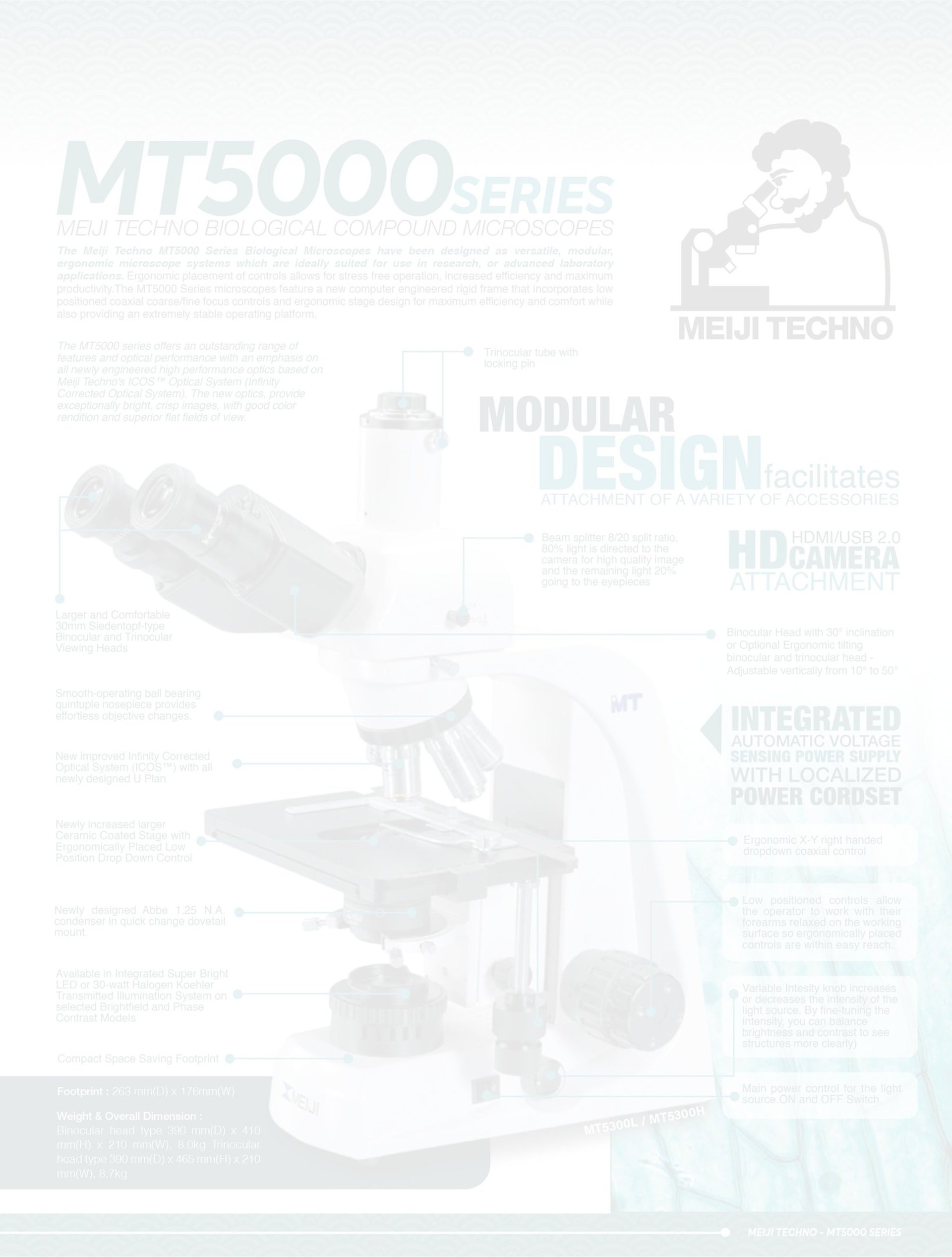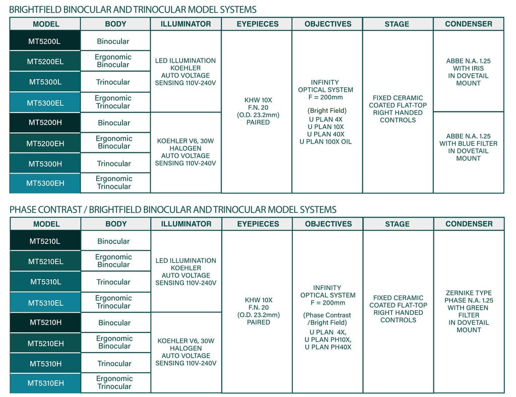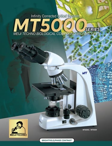 An optical microscopy technique that converts phase shifts in light passing through a transparent specimen to brightness changes in the image. Phase shifts themselves are invisible, but become visible when shown as brightness variations. When light waves travel through a medium other than vacuum, interaction with the medium causes the wave amplitude and phase to change in a manner dependent on properties of the medium. Changes in amplitude (brightness) arise from the scattering and absorption of light, which is often wavelength-dependent and may give rise to colors. Photographic equipment and the human eye are only sensitive to amplitude variations. Without special arrangements, phase changes are therefore invisible.The MT5000 Series is one of our most rugged fully equipped biological microscope systems. Created to meet the demands of researchers and clinical laboratory specialists. The MT5000 Series microscopes feature a new computer engineered rigid frame that incorporates low positioned coaxial coarse/fine focus controls and ergonomic stage design for maximum efficiency and comfort while providing and extremely stable platform. The cast aluminum alloy metal stand has a chemical resistant finish and is the most rugged, durable finish in the market today. Equipped tension adjustment controls and a built in stage stop lever to protect the specimen and objectives from accidental damage during use. The MT5000 Series offers an outstanding range of optical performance with an emphasis on all newly engineered high performance U. Plan optics. The new optics, provide exceptionally bright, crisp images with good color rendition and superior flat fields of view. The MT5000 Series have bigger stage and 30mm wider eyepiece compared to the MT4000 Series.