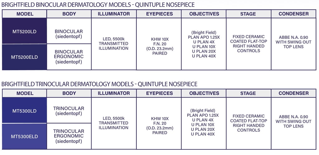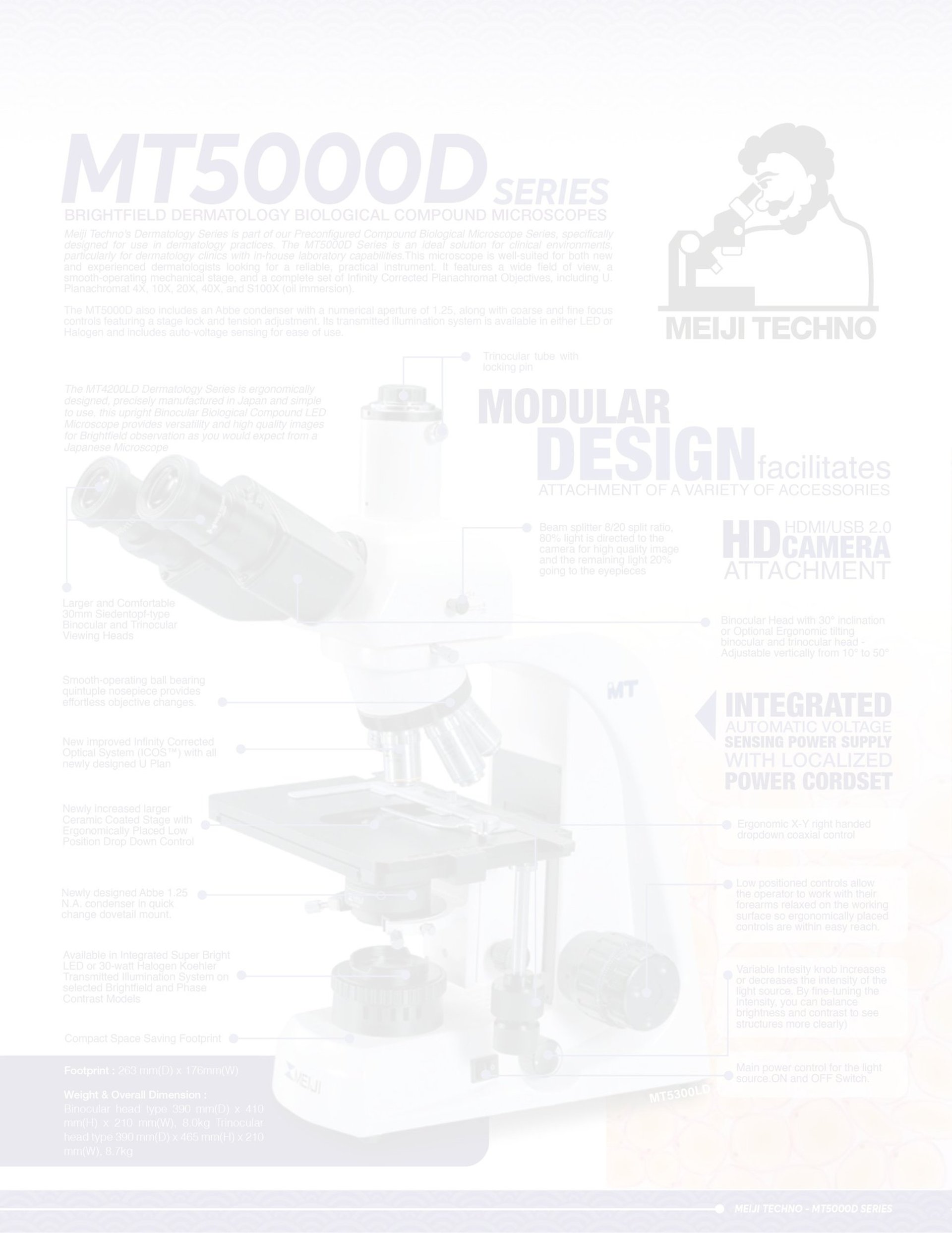 The MT5000D Series are used to view prepared thin slices of thin tissue, which have a common setup that utilizes lower magnification objective lenses 4X, 10X, 20X and 40X. The lowest magnifications are typically used most frequently. When using a dermatology microscope the samples must be sliced thinly in order to allow the physician to view it clearly.