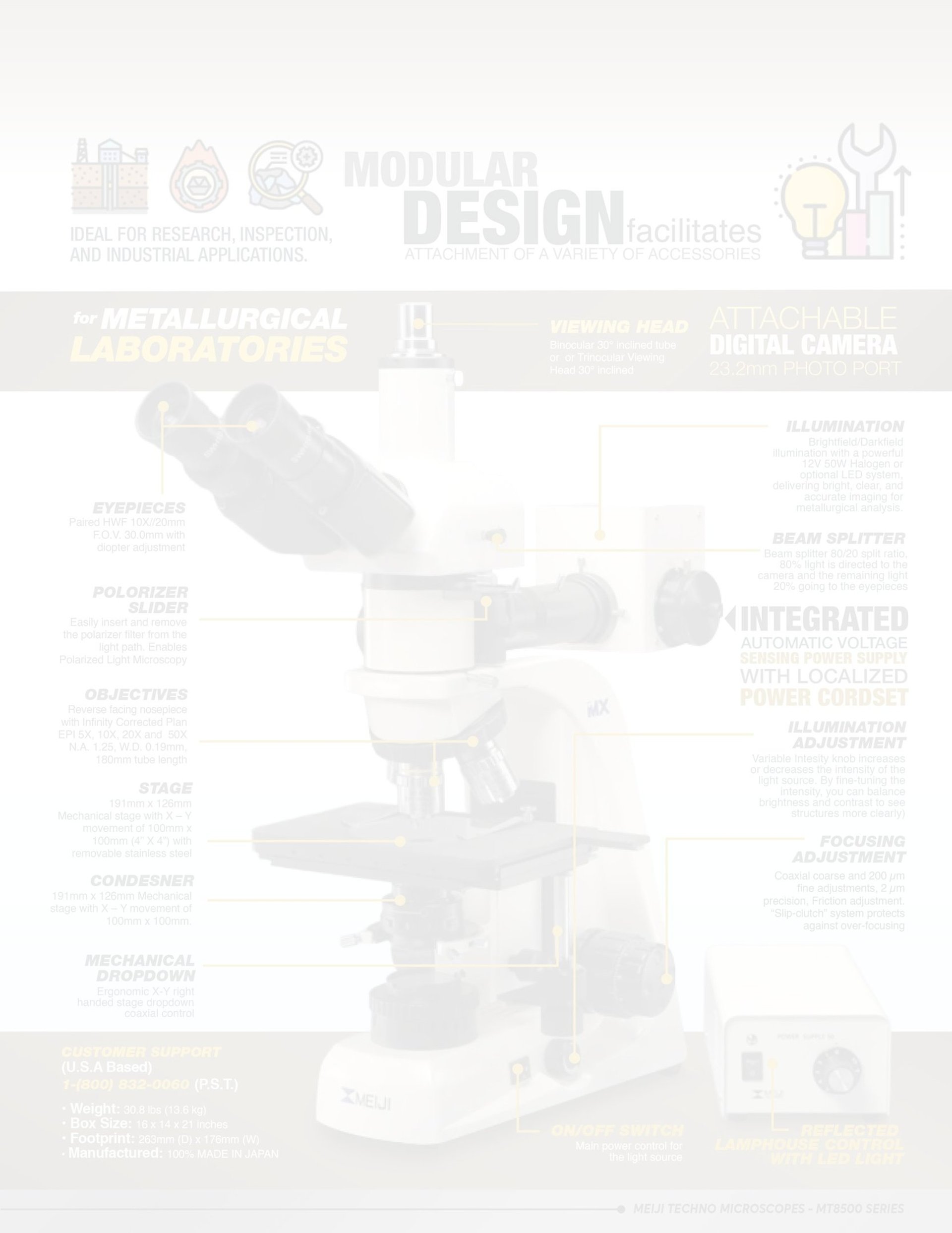 Automatic voltage sensing (100V-240V) power supply and variable rheostat control are supplied in a separate case. Transmitted light Koehler illuminator with 6V 30W halogen lamp, automatic voltage sensing transformer and intensity control are built into the microscope base.