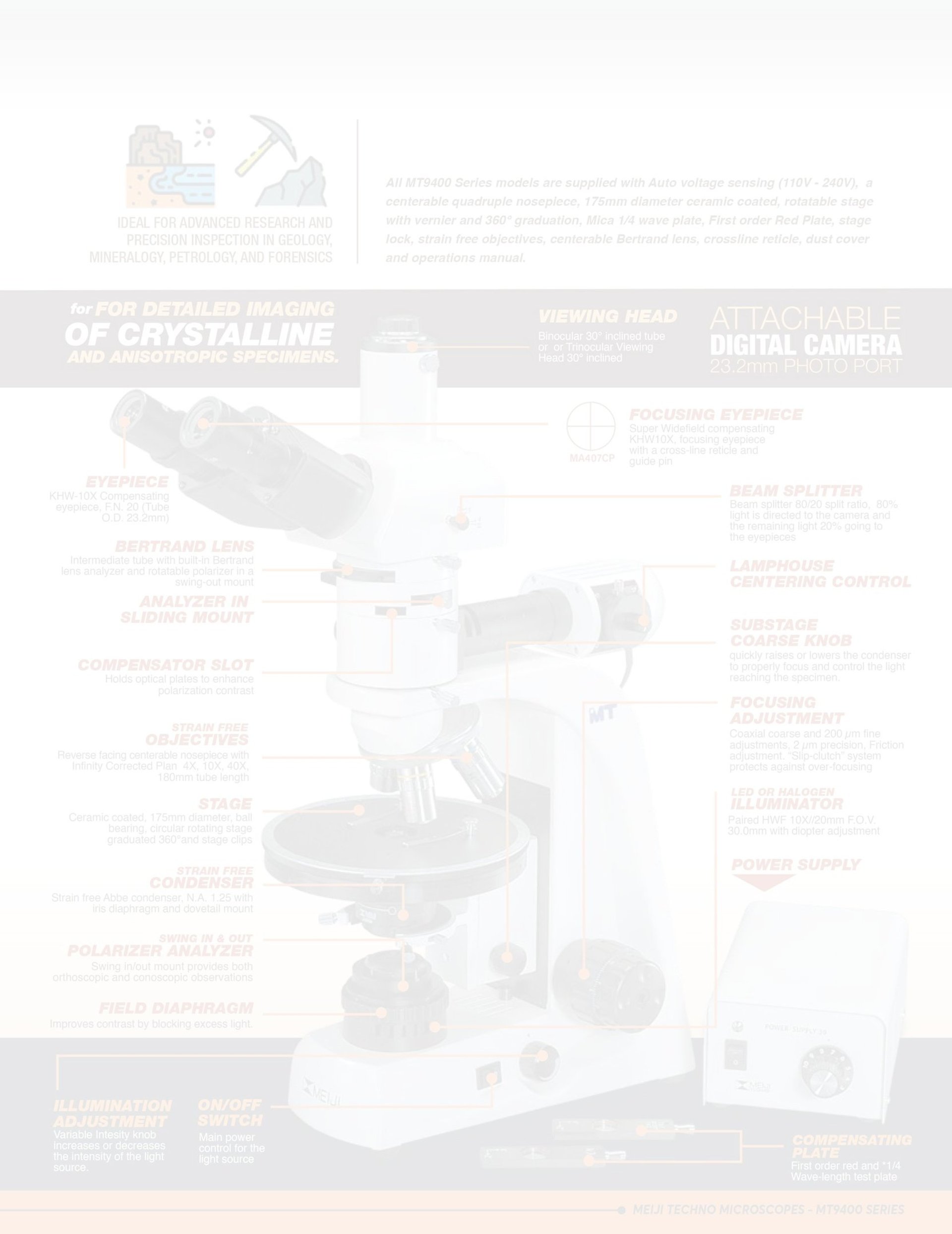 30 watt Koehler Halogen illumination allowing observation of clear images of polarization with automatic voltage sensing power supply 110V-240V